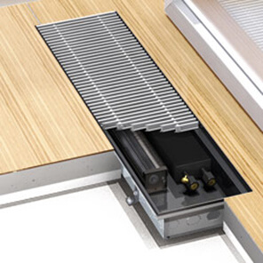 Канальные конвекторы Aquilo F1T предназначены для монтажа в полах обогреваемых помещений. Нагревательным элементом является медно-алюминиевый теплообменник, окрашенный в черный цвет, установленный в стальной ванне, оцинкованной с обеих сторон, с внутренней стороны также окрашенной в черный цвет. Конвекторы Aquilo F1T оснащены бесшумными центробежными вентиляторами, которые установлены в ванной рядом с теплообменником, количество этих вентиляторов зависит от длины теплообменника. Благодаря им обеспечивается принудительная циркуляция воздуха и, как следствие, большая производительность конвектора. Вентиляторы приводятся в движение двигателями, рассчитанными на напряжение 12 В. Сверху конвектор закрыт поперечной декоративной решеткой, изготовленной из предлагаемого производителем материала, которая заказывается отдельно. Подключение конвектора к системе отопления выполняется с помощью двух патрубков с внутренней резьбой G ½ «. Обязательное электрическое оснащение, которое заказывается отдельно, состоит из соответственно подобранного трансформатора (на штукатурку либо под штукатурку), а также настенного регулятора, управляющего оборотами вентилятора.